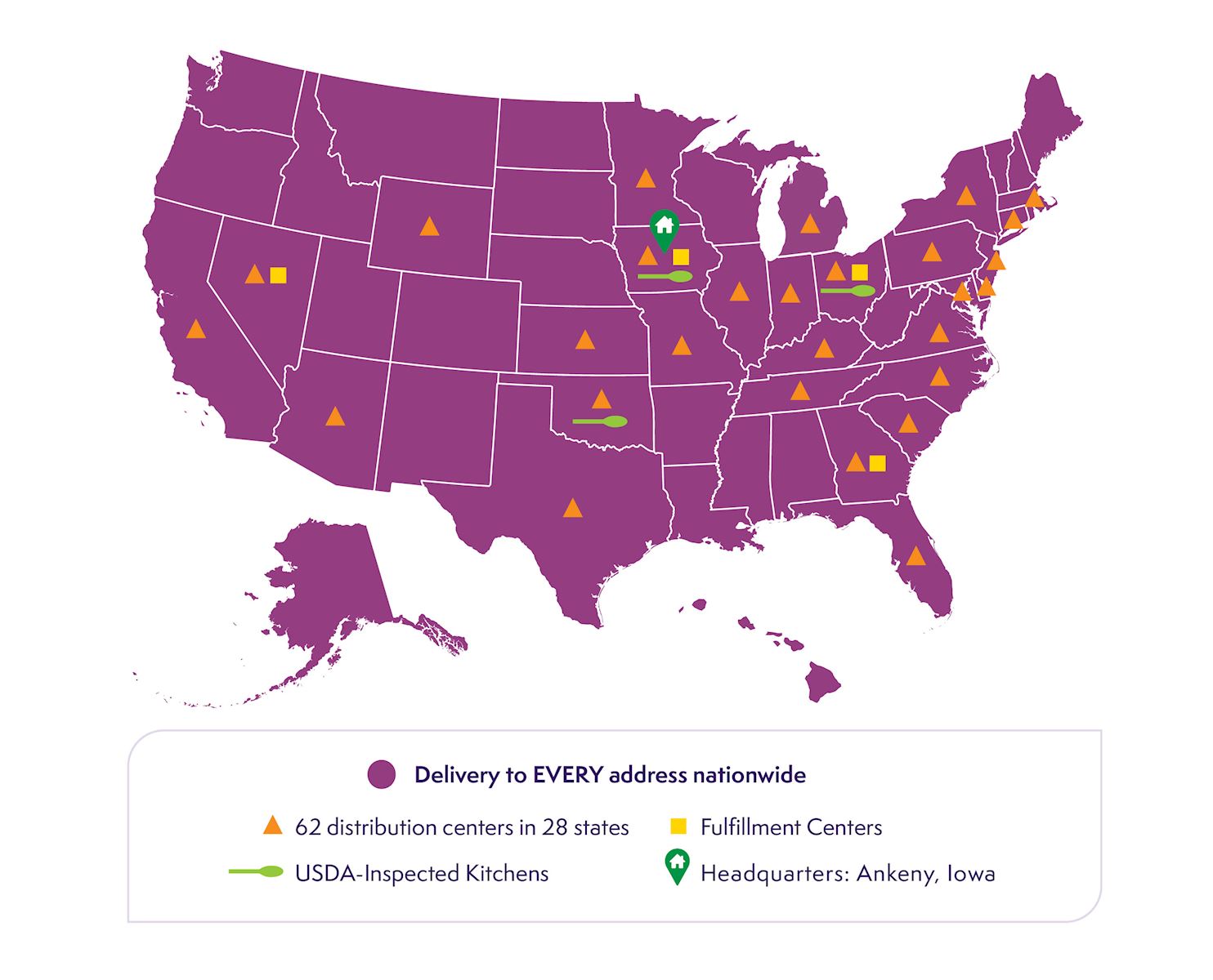 Mom's Meals® has 69 strategically placed locations across the United States to provide accessible nutrition, even to the most remote address.
